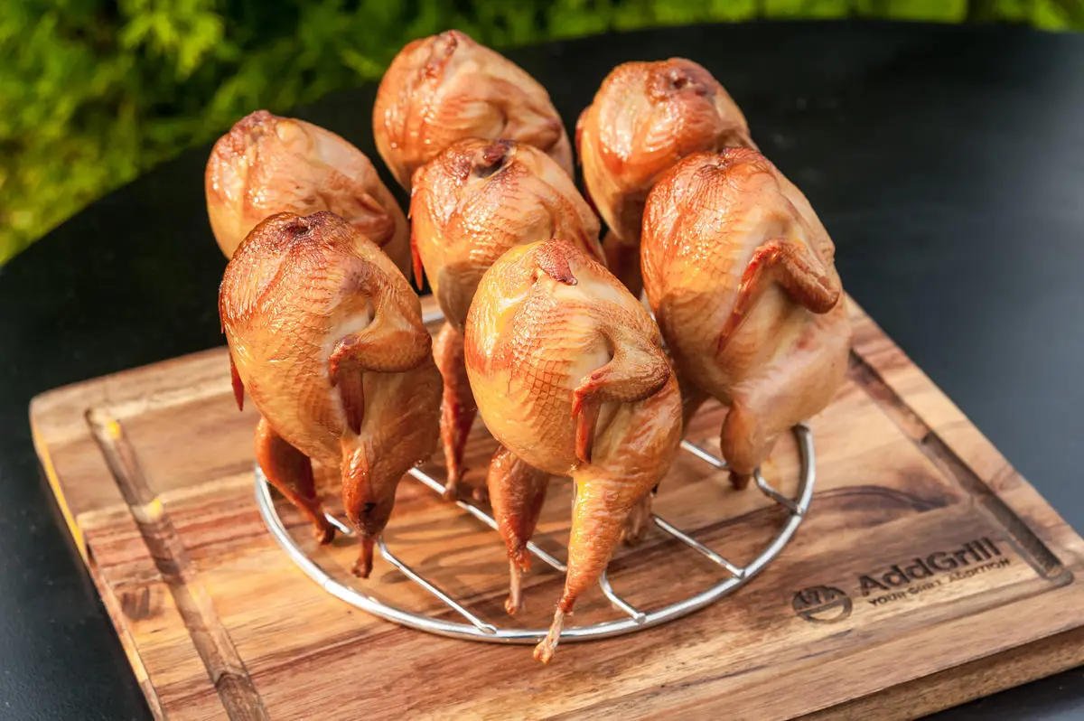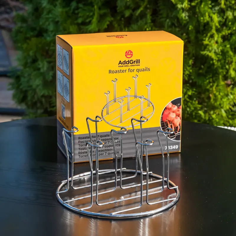 Этот миниатюрный ростер позволяет комфортно запечь или закоптить до 7 перепёлок в любом гриле или духовке. Идеальная золотистая корочка без изъянов и нежное, сочное мясо внутри теперь доступно любому! Также на этом ростере великолепно получаются болгарские перцы! Прекрасно помещаются на этот ростер до 3 цыплёнков корнишонов.