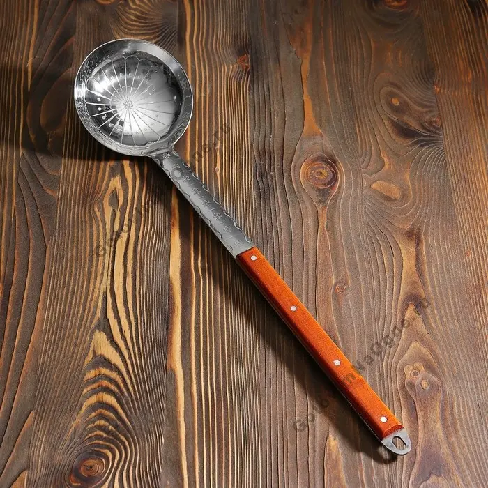 Половник с нанесенным на него оригинальным орнаментом, изготовлен из нержавеющей стали внушительной толщины (3 мм.) и не погнется при использовании. Деревянная ручка половника, которая не нагреется во время перемешивания и подачи блюд, имеет удобную петлю, что позволяет легко разместить половник на крючке для хранения.