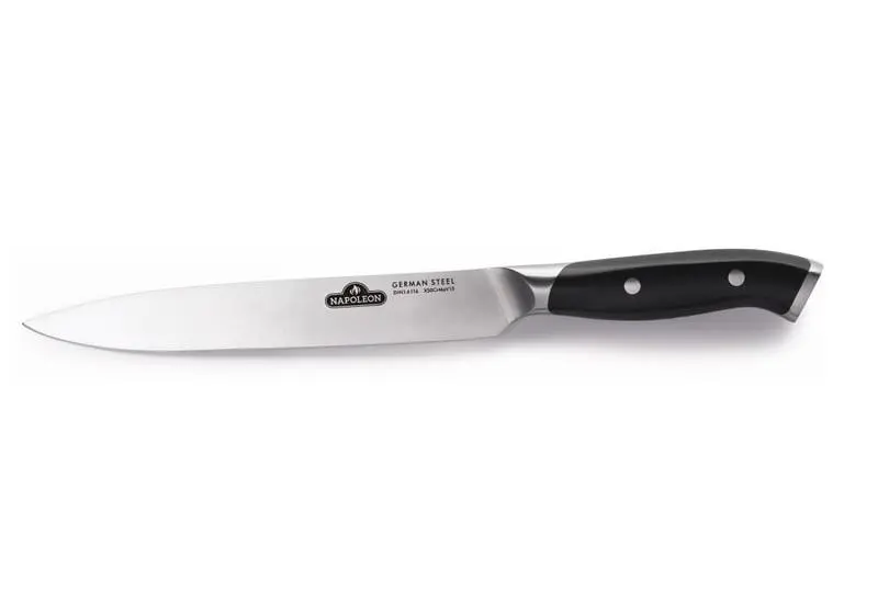 Разделочный нож NAPOLEON, отлично справится с отделением мяса от костей и просто с нарезкой больших кусков мяса или рыбы. Прекрасно подойдет для самостоятельной нарезки стейков. Удобная ручка и немецкая сталь. Длина ножа - 33 см., длина лезвия - 20 см.