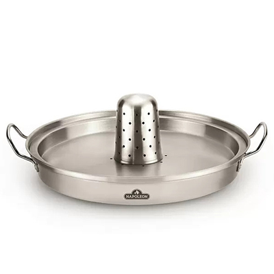 Ростер из нержавеющей стали для запекания курицы на гриле состоит из противня с ручками и насадки. Противень устанавливается на основной решетке гриля и может использоваться для одновременного приготовления гарнира и птицы.