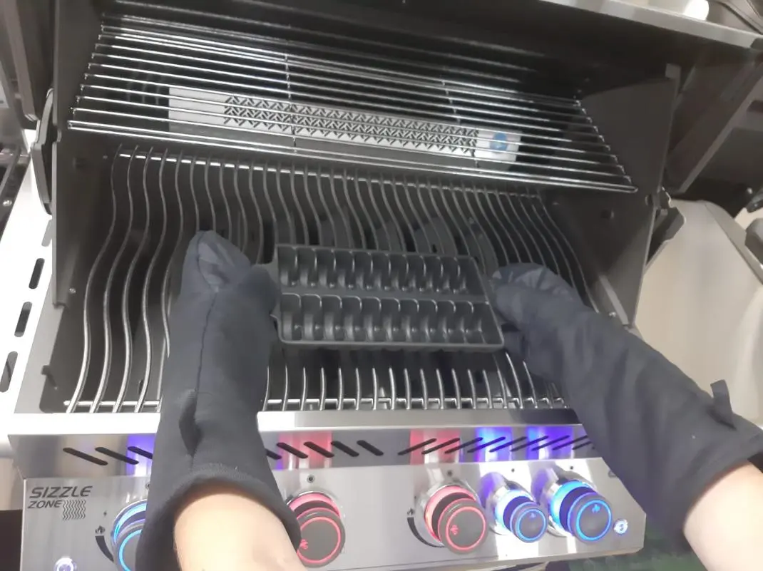 - Снимать-ставить раскаленные решетки гриля или контейнеры для копчения.