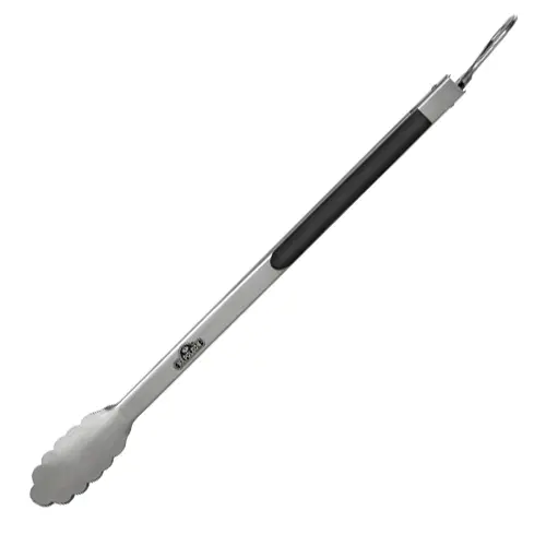 Прочные щипцы для гриля из полированной нержавеющей стали с эргономичной прорезиненной ручкой.