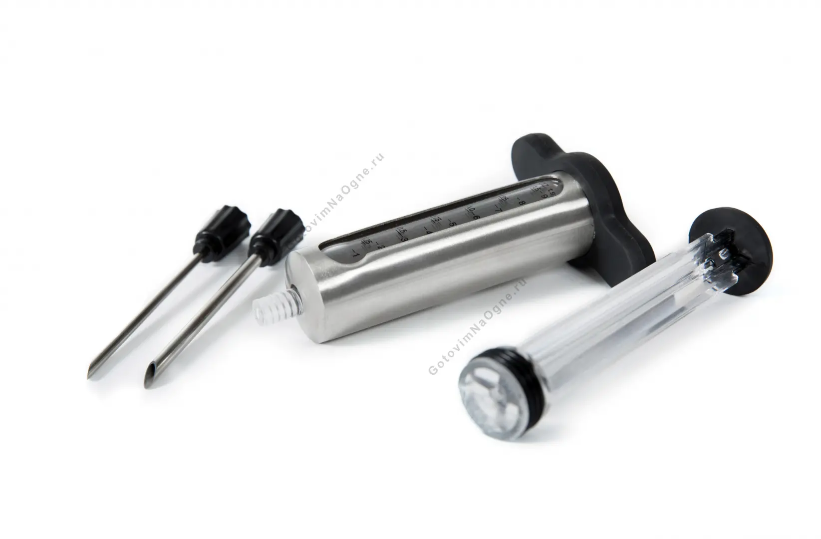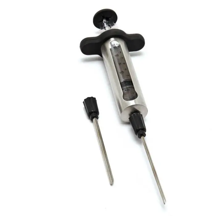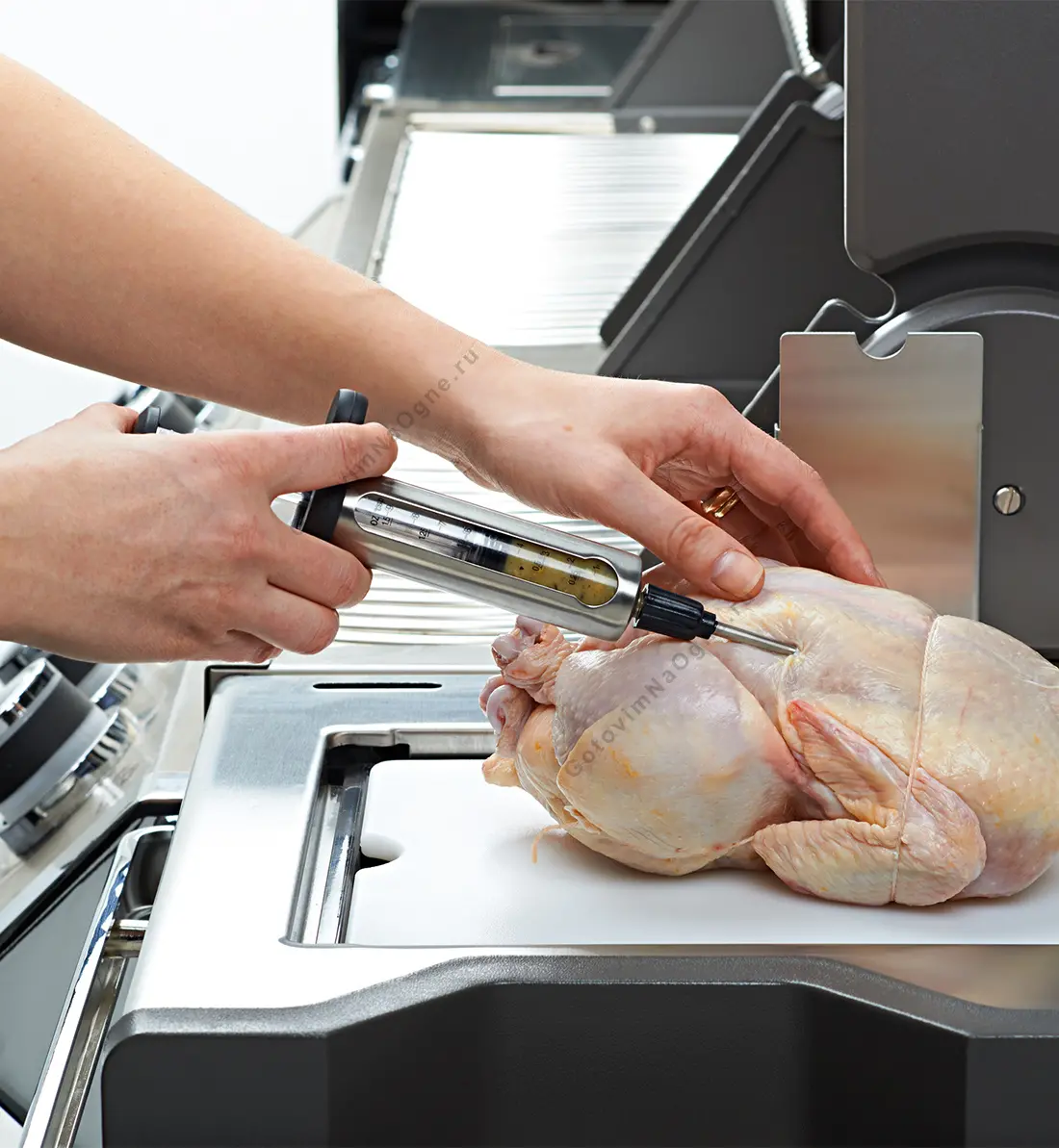 Отличный аксессуар для придания аромата мясу. Включает в себя две иглы, с большими отверстиями, и вторая игла с малыми отверстиями, а также окно с градуировочной маркировкой для точного контроля количества впрыскиваемого маринада. Шприц разбирается для легкой очистки.