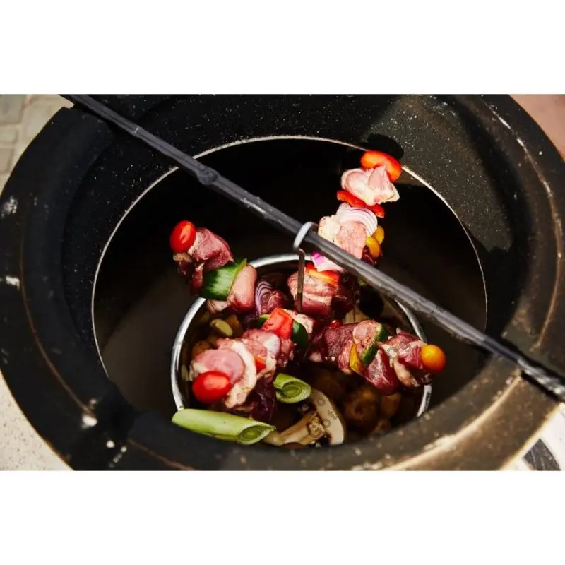 На тарелке «ЁЛОЧКА» запекают грибы, картофель, и другие овощи, мясо и многое другое, что менее удобно готовить на шампурах или многоярусной тарелке. Важно отметить, что приготовление на тарелке "Елочка" еще и более полезно. Жир от мяса не капает на угли, тем самым не образуются канцерогены. Насадите на "елочные ветви" сочное мясо или птицу и разместите под ними на тарелке картофель, и вы увидите, результат будет превосходный! Печёная картошка и овощи гриль, получаются особенно вкусные, т.к. в процессе приготовления пропитываются соками мяса или птицы расположенных на елке. Устройство крепится на тандыр с помощью кочерги.