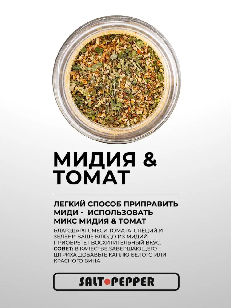 Благодаря смеси томата, специй и зелени ваше блюдо из мидий приобретет восхитительный вкус. Совет: в качестве завершающего штриха добавьте каплю белого или красного вина. Банка 200 мл. Состав: Соль, томат, цедра лимона, черный перец, чеснок, лук, семена укропа, петрушка, перец чили, лимонная кислота. Натуральные специи без красителей, ГМО, консервантов.