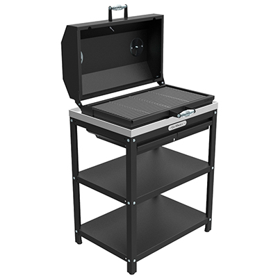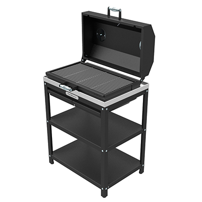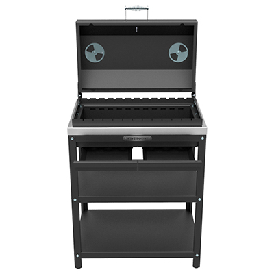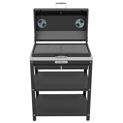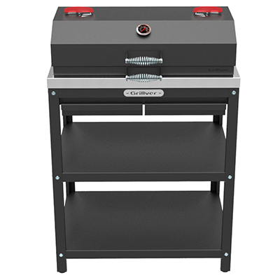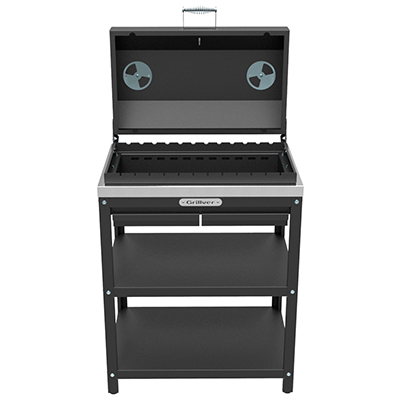 Профессиональный уличный стол-гриль GRILLVER с решёткой из чугуна и крышкой-гриль. Топка снабжена наружным кожухом (для снижения теплоизлучения от внутренней топки), т.е. топка двустенная. Перфорированное дно. Два поддувала с зольными ящиками.
