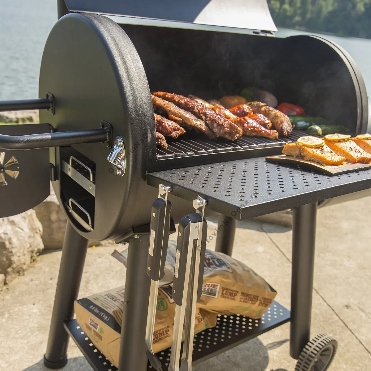 Внутри основной камеры находится большая чугунная двусторонняя решетка 62х49 см. Вентили для регулировки температуры выполнены из жаропрочного чугуна. Гриль имеет большие колеса, современную фурнитуру и удобную полку с крючками для инструментов.