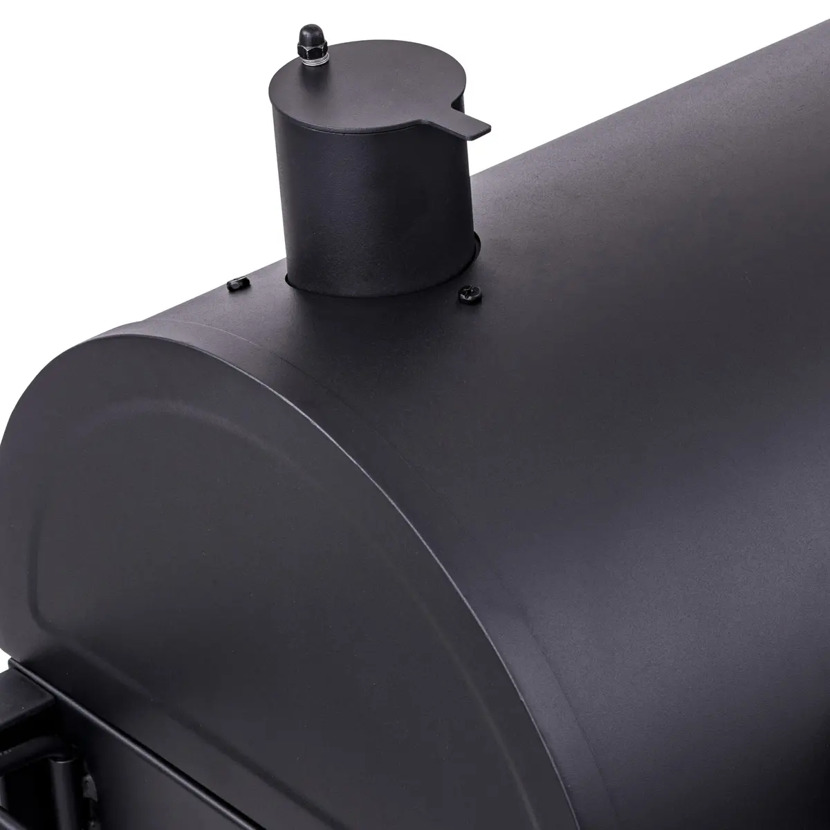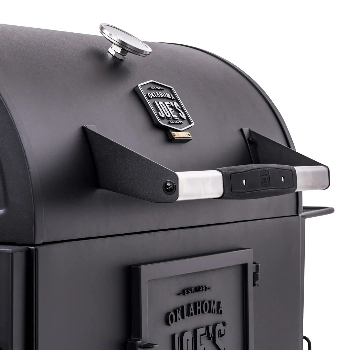 Большой угольный гриль OKLAHOMA JOE'S Judge с чугунной решеткой и регулировкой по высоте поддона для угля, изготовлен из толстой листовой стали (4мм.) - что говорит о надежности и долговечности конструкции, сетчатые боковые столики при необходимости можно вынимать из пазов, что существенно уменьшает габариты гриля во время хранения. Сетчатая полка у основания подойдет для хранения стартера и рабочих инструментов.