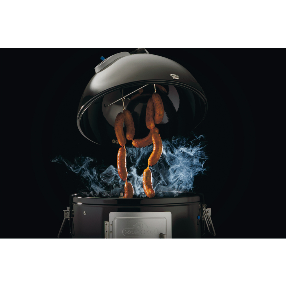 При сборке всех элементов NAPOLEON® Apollo 22 превращается в высокий вертикальный смокер с двумя уровнями приготовления. Такая конструкция позволяет коптить продукты на разных высотах и создавать внутри различные температурные зоны. Если не использовать ёмкость для воды или льда - получится классическая вертикальная коптильня. Если же наполнить ёмкость холодной водой или льдом - температура внутри понижается, создаётся влажная среда, что идеально подходит для деликатного копчения и улучшает вкус и сочность продуктов. Ёмкость для воды - не только влажность, но и защита. Установленная ёмкость работает также как отражатель жара. Она равномерно распределяет тепло внутри камеры и защищает продукты от прямого воздействия огня. Это особенно важно при копчении, так как стабильная температура напрямую влияет на вкус, текстуру и качество готового блюда.