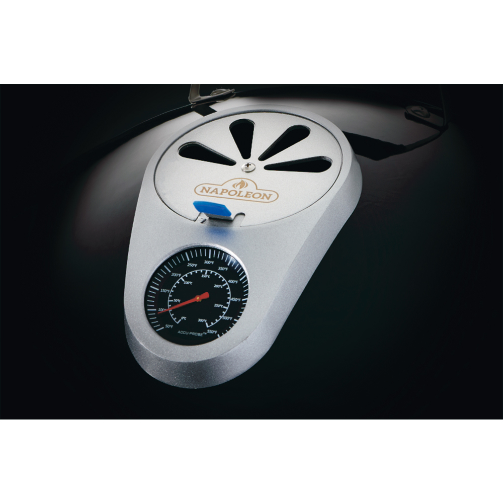 Верхняя шиберная заслонка позволяет регулировать температуру, управляя потоком горячего воздуха. Для безопасности она оснащена термостойкой насадкой. Заслонка объединена с фирменным термометром ACCU-PROBE™, который отображает температуру в градусах Цельсия. Также на шкале указаны рекомендуемые диапазоны для различных режимов: копчение, запекание, обжарка.С внутренней стороны крышки предусмотрена штанга для установки пяти S-образных крючков, на которые подвешиваются продукты во время копчения.