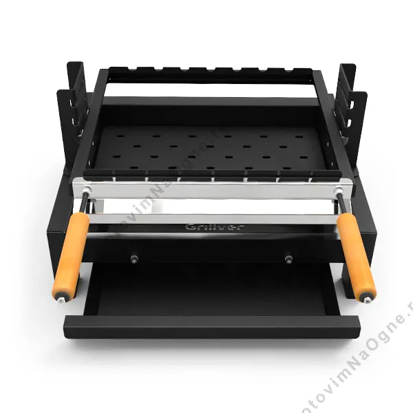Съемная рамка с пазами для фиксации шампуров,конструкция Step-fix, позволяющая регулировать расстояние от углей до готовящейся еды, зольный ящик |