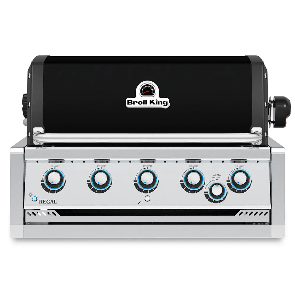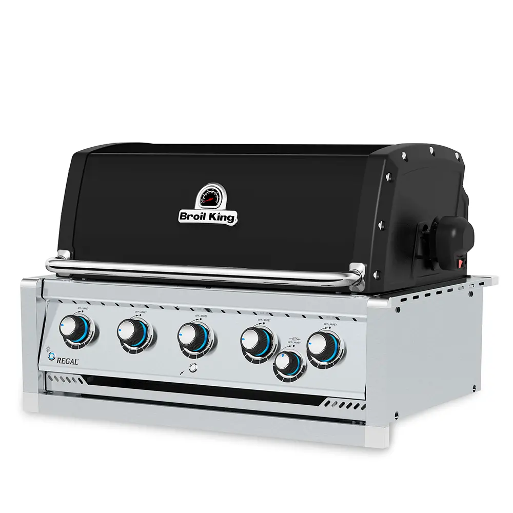 Встраиваемый газовый гриль BROIL KING REGAL 570BI, 5 основных горелок Dual-Tube мощностью-16 кВт, горелка для вертела мощностью-4,4 кВт, вертел, 5 чугунных двусторонних решеток и дополнительная решетка из стальных прутьев покрытая керамической эмалью, подсветка ручек.