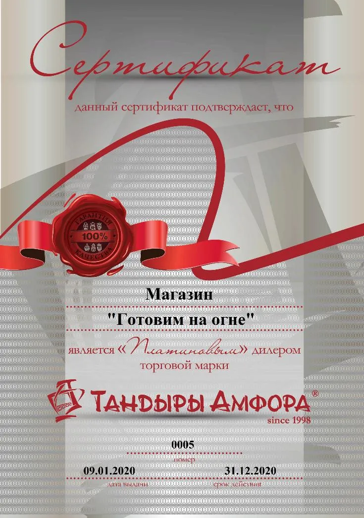 Компания "Готовим на огне" в 2019 году получила наивысшей статус "DIAMOND" сертифицированного магазина тандыров АМФОРА и по итогам продаж с 2015 по 2025 год является официальным дилером АМФОРА №1 в Санкт-Петербурге и Москве.
