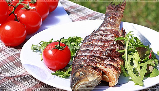 - На решетку-гриль выкладываем фаршированного карпа в один ряд, фиксируем и устанавливаем на мангал. Готовим рыбы на умеренном жаре, не забываем переворачивать решетку с рыбой каждые 3 минуты для равномерной прожарки с каждой стороны, и смазываем рыбу нашим соусом силиконовой кистью. Время приготовления 15-20 минут.