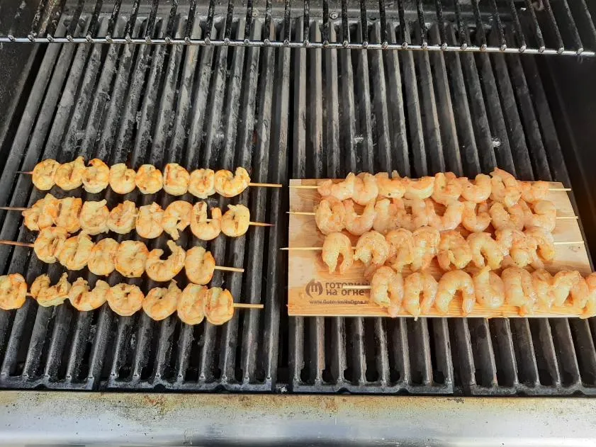 - Выложите шпажки с креветками на разогретую решетку гриля.