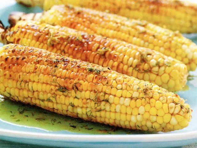 Уложите кукурузные початки рядом друг с другом на противень, подходящий по размеру для гриля. Смажьте сливочным маслом с лимоном и карри и поставьте поднос на решетку гриля. Готовьте в режиме прямого среднего жара при закрытой крышке около 5 минут, пока сливочное масло не растопится и кукурузные початки не станут теплыми. Если нужно, переверните. Початки можно подержать на противне на непрямом жару, чтобы были теплыми, пока, например, на гриле готовятся другие блюда.