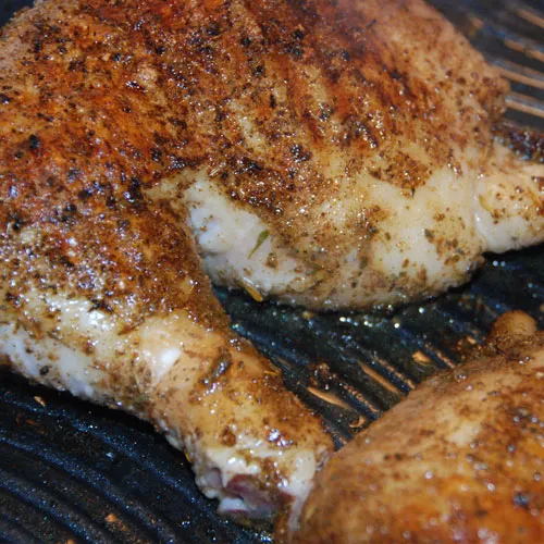 - Когда гриль готов, выключите половину горелок. Полейте каждое бедро 1 столовой ложкой