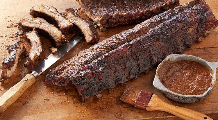 - Снимаем готовые ребрышки с гриля и слегка смазываем их с обеих сторон соусом. Оборачиваем каждую ленту плотной фольгой и выкладываем в зону непрямого слабого жара. Готовим под крышкой, пока мясо не станет нежным (ещё 35-40 минут). Снимаем ребрышки с гриля и разделяем ленты на отдельные ребрышки. Подаем блюдо к столу теплым с оставшимся соусом.