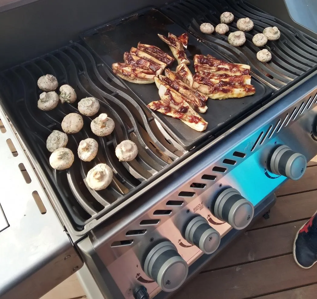 - Нагреваем гриль до 200С и на среднем жаре обжариваем на каждой стороне по 5 минут. Мощность горелок, над которыми будут лежать грибы, должны быть выставлены на 50% не более. Если гриль с 4 горелками, то установите их все на минимум.