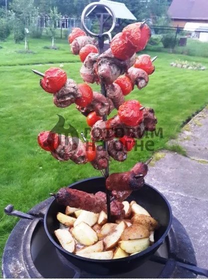 Для приготовления еды в тандыре есть много приспособлений: вертикальные шампура, специальные решетки, коптильни и т. п. Сегодня используем приспособление под названием «елочка». Внизу глубокая чугунная сковородка в которую кладем картофель, выше небольшие шампура в виде елочки для мяса. Маринованные куски мяса нанизываем на острые прутья.