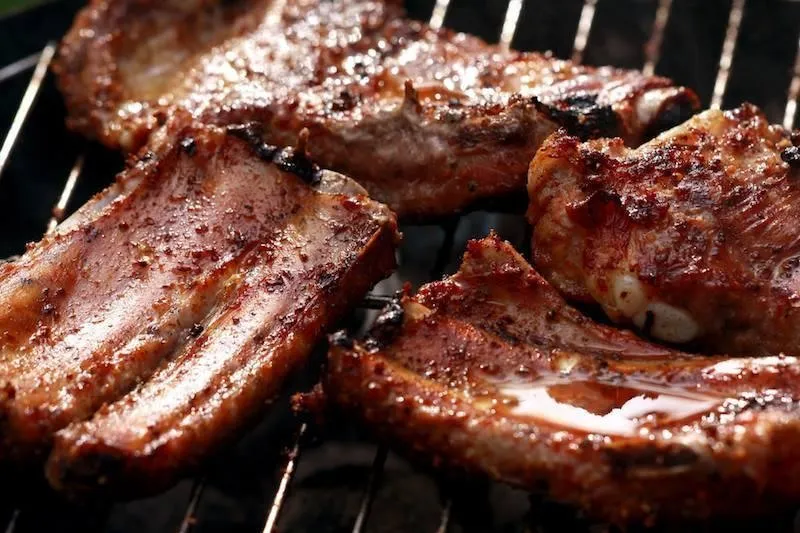 Затем немного углей отодвиньте или потушите и жарьте на среднем жаре до готовности - постоянно переворачивая решетку (около 25 минут). Готовность можно проверить - воткнув нож в мясо. Если оно на срезе чуть розовое, но без признаков крови - ребрышки готовы.