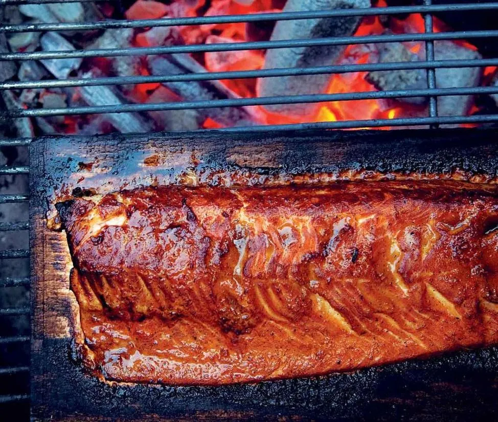 - Снимите доску с рыбой с гриля на термоковрик или блюдо, накройте листом фольги на несколько минут и затем подавайте нашу "Cёмгу по-Канадски" к столу горячей.