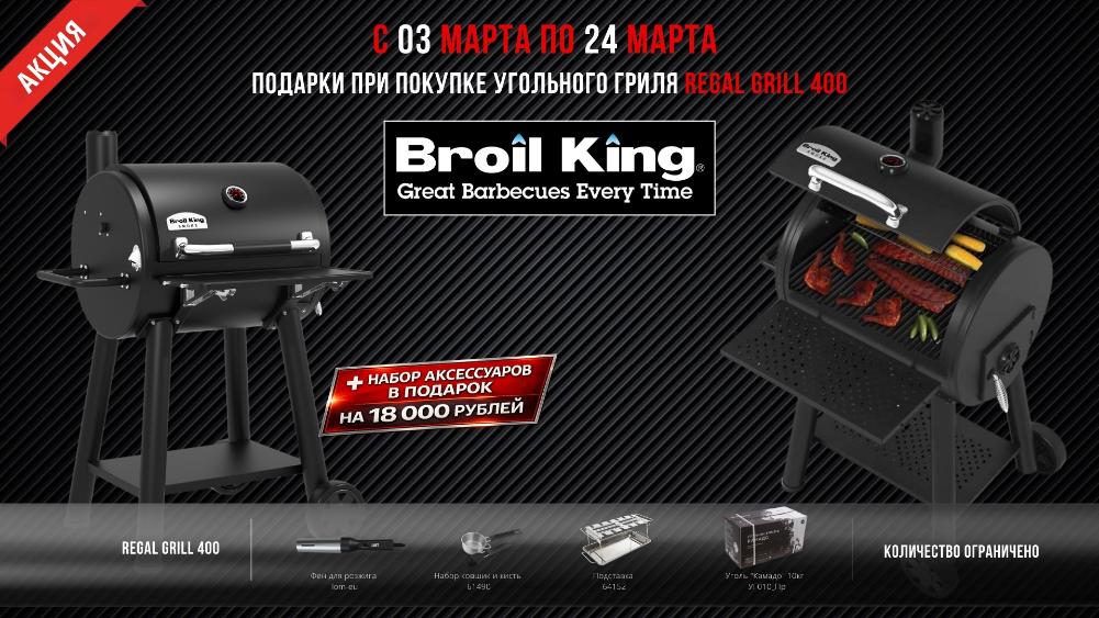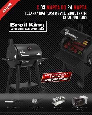 При покупке угольного гриля Regal Grill 400 от компании Broil King вы получаете набор аксессуаров на 18 000₽ в подарок.